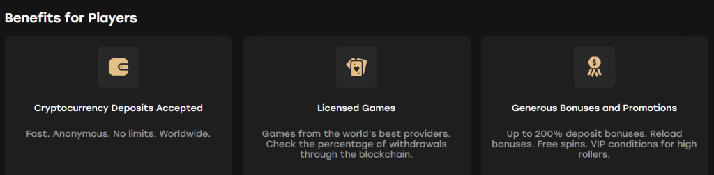 Ez az üzemeltető számos ügyfélközpontú funkcióról ismert. Az egyszerű kriptovaluta kaszinó belépési feltételeken túl számos irányelvet kínál a biztonságos, átlátható és tisztességes játékmenet érdekében bármely felhasználó számára a platformon.